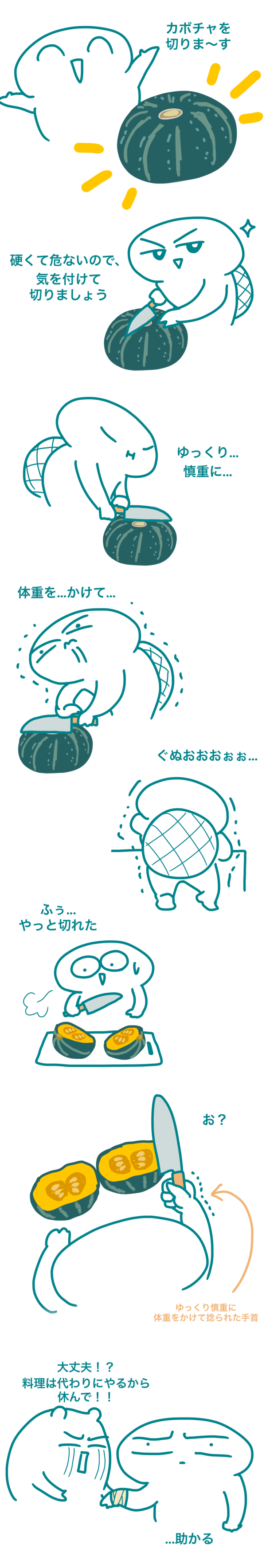 変な切り方でカボチャを切ったら手首を痛めてしまい、治るまでかなり時間がかかりました…